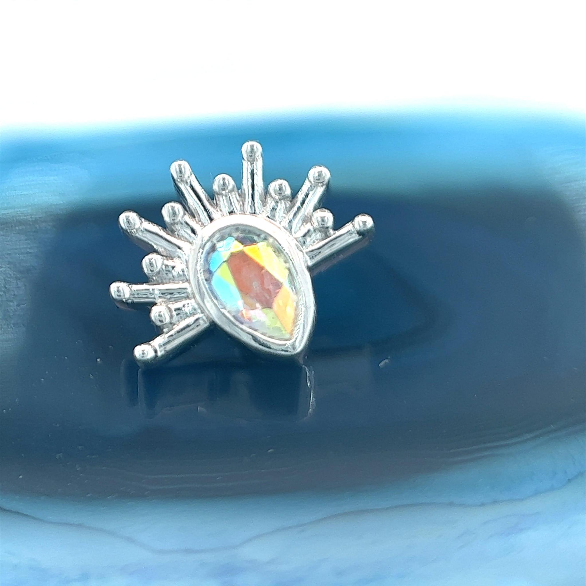Introducing the Borderline Pear, a mesmerizing a 16g /18g threaded jewelry piece meticulously crafted in 14k solid white gold by BVLA. This 9x8mm end features (1) 4×2.5mm genuine pear-cut Mercury Mist Topaz, elegantly cradled in a secure bezel setting.