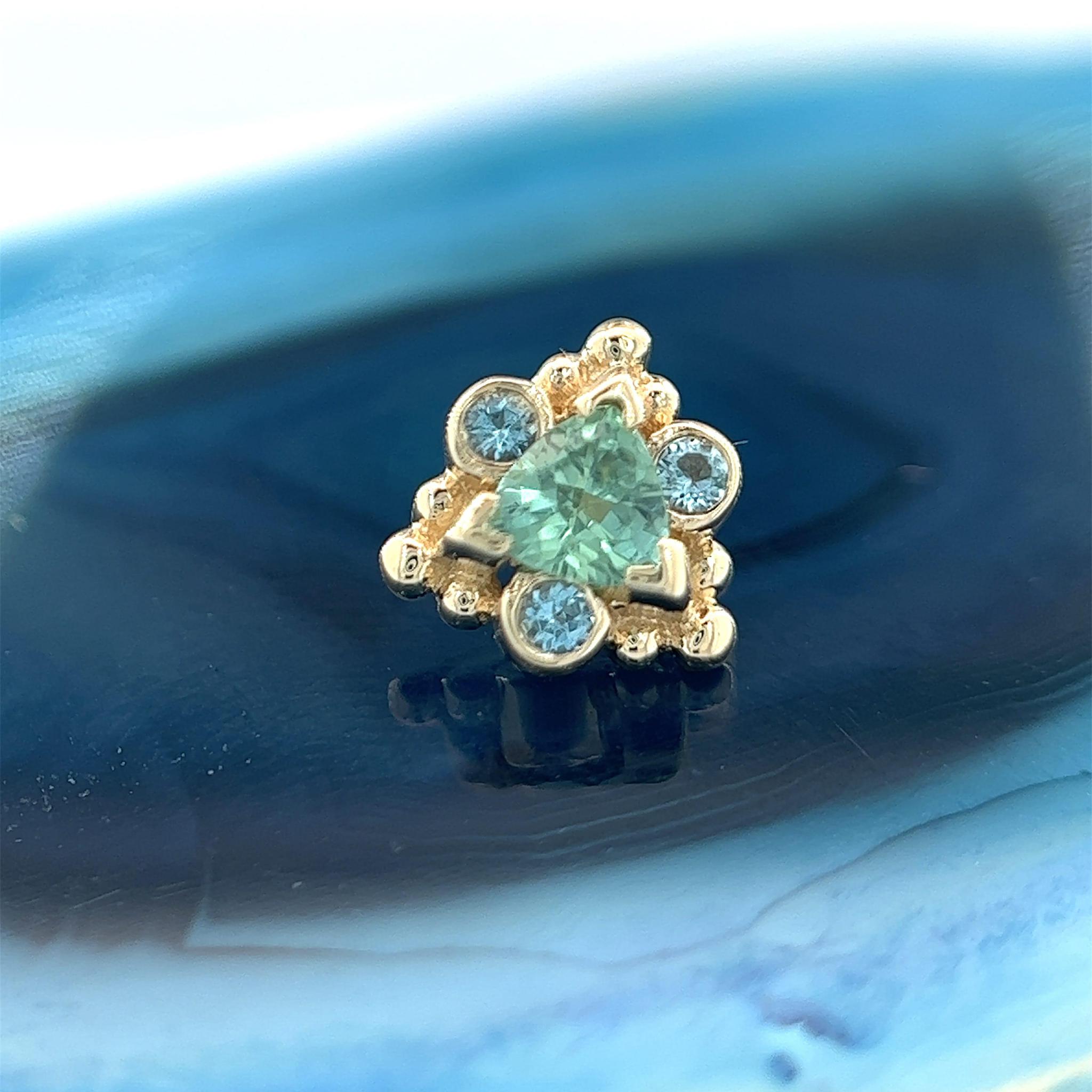 Embrace the tranquil beauty of the sea with BVLA’s exquisite Helana body jewelry. This ornate 16g threaded piece features a striking 3mm trillion cut sea foam tourmaline, its cool green-blue hue evoking ocean depths. Flanking it, two dazzling 1.25mm aquamarines lend a dash of brightness like sea spray. Meticulously prong set in radiant 14k yellow gold with BVLA’s signature satin finish. Measuring approximately 8mm long, Helana adorns helix and forward helix piercings with refined elegance. Sea foam tourmaline inspires emotional healing and calm. For ocean lovers who appreciate unique design, Helana invokes the restorative power of crashing waves and the mystery of the tide. An enduring treasure from the sea.