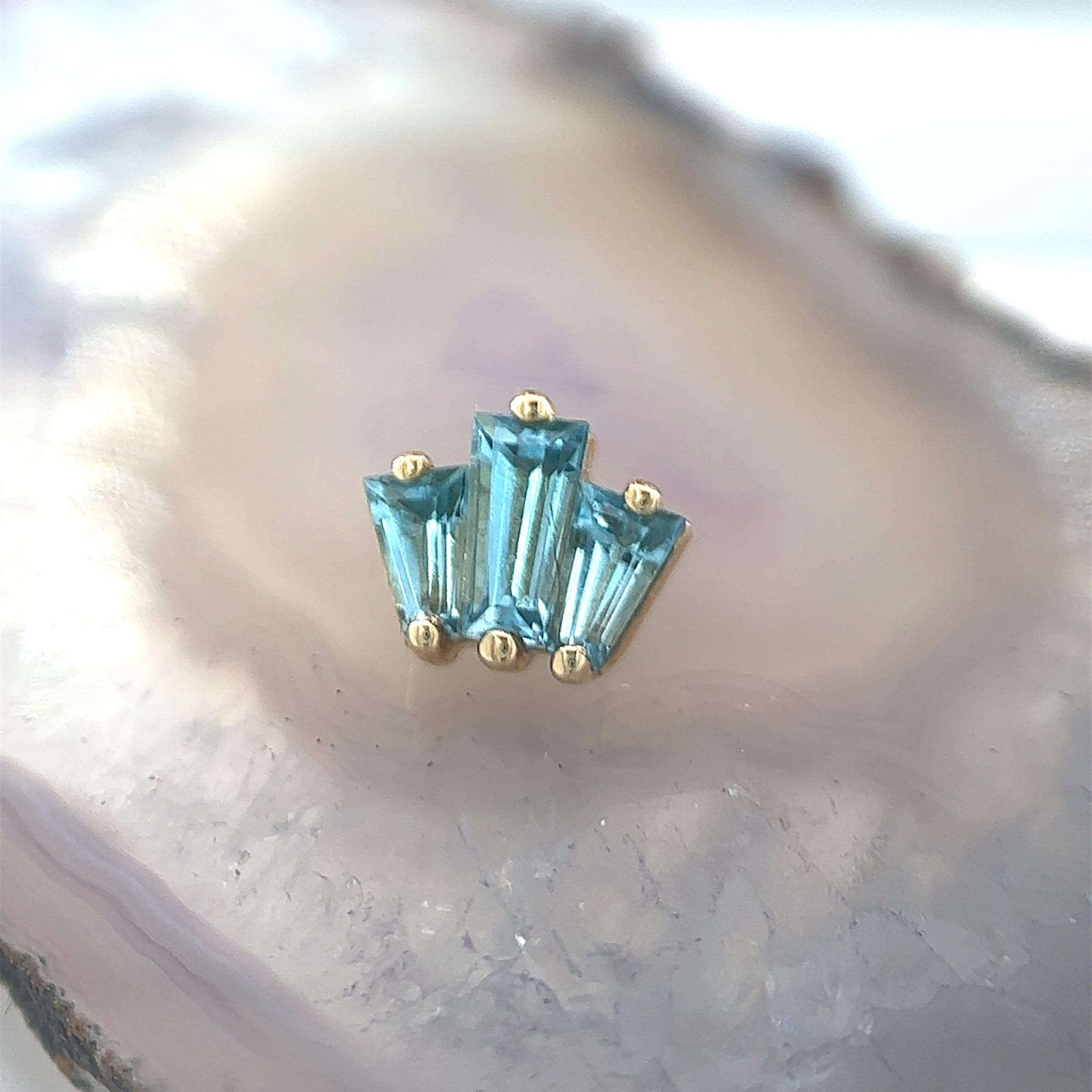 Dive into a world of elegance with our Oceane Swiss Blue Topaz 14k Solid Yellow Gold End, a true gem from BVLA. This threaded jewelry piece features a trio of genuine Swiss Blue Topaz stones, gracefully graduating in size from small to large and back to small, resembling a shimmering wave frozen in time. These tapered baguettes are securely cradled within a 2-prong setting, adding an extra touch of sophistication.