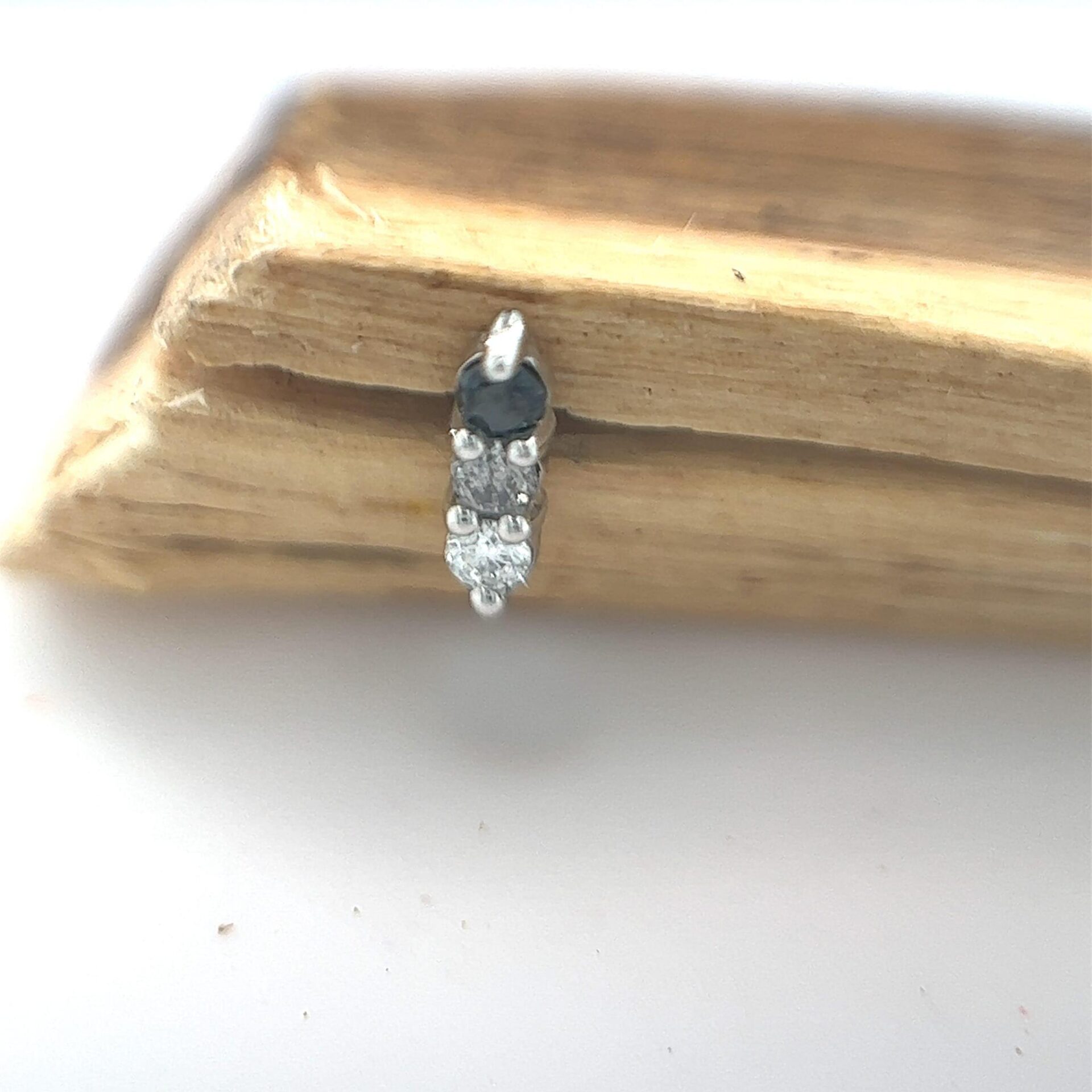 Introducing our Ombre Dia 1mm Black, Gray, White Diamond 14k Solid White Gold End, a stunning creation by BVLA. This threadless jewelry piece features a trio of 1mm Diamonds, each showcasing a unique color gradient from Black to Gray and finally to White. These diamonds are elegantly set in a linear tri-prong cluster, creating a captivating visual effect. Crafted with meticulous precision, the 14k white gold setting adds a touch of opulence while ensuring lasting durability. This jewelry piece measures 3mm in length and is a perfect embodiment of both luxury and individuality. Discover the perfect blend of sophistication and personal expression with this exquisite BVLA creation.