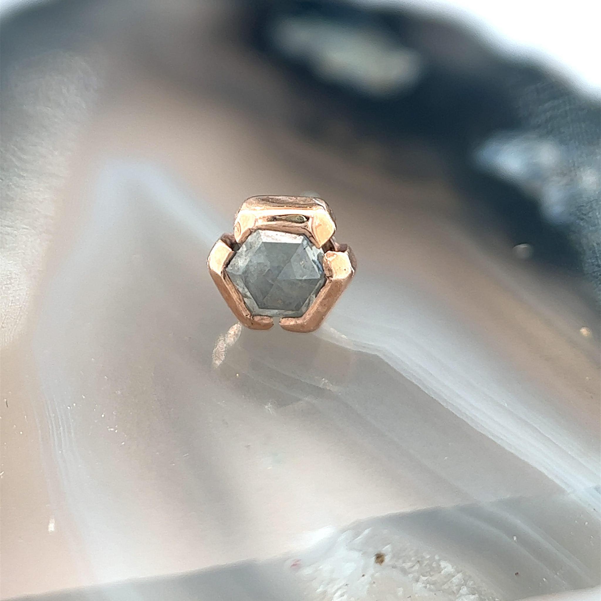 Handcrafted from solid 14k rose gold, this end boasts a 3.5mm Icy Hexagon cut Salt & Pepper Diamond. What sets it apart is the distinctive 3-wall-style bezel setting, framing the diamond with precision and style.