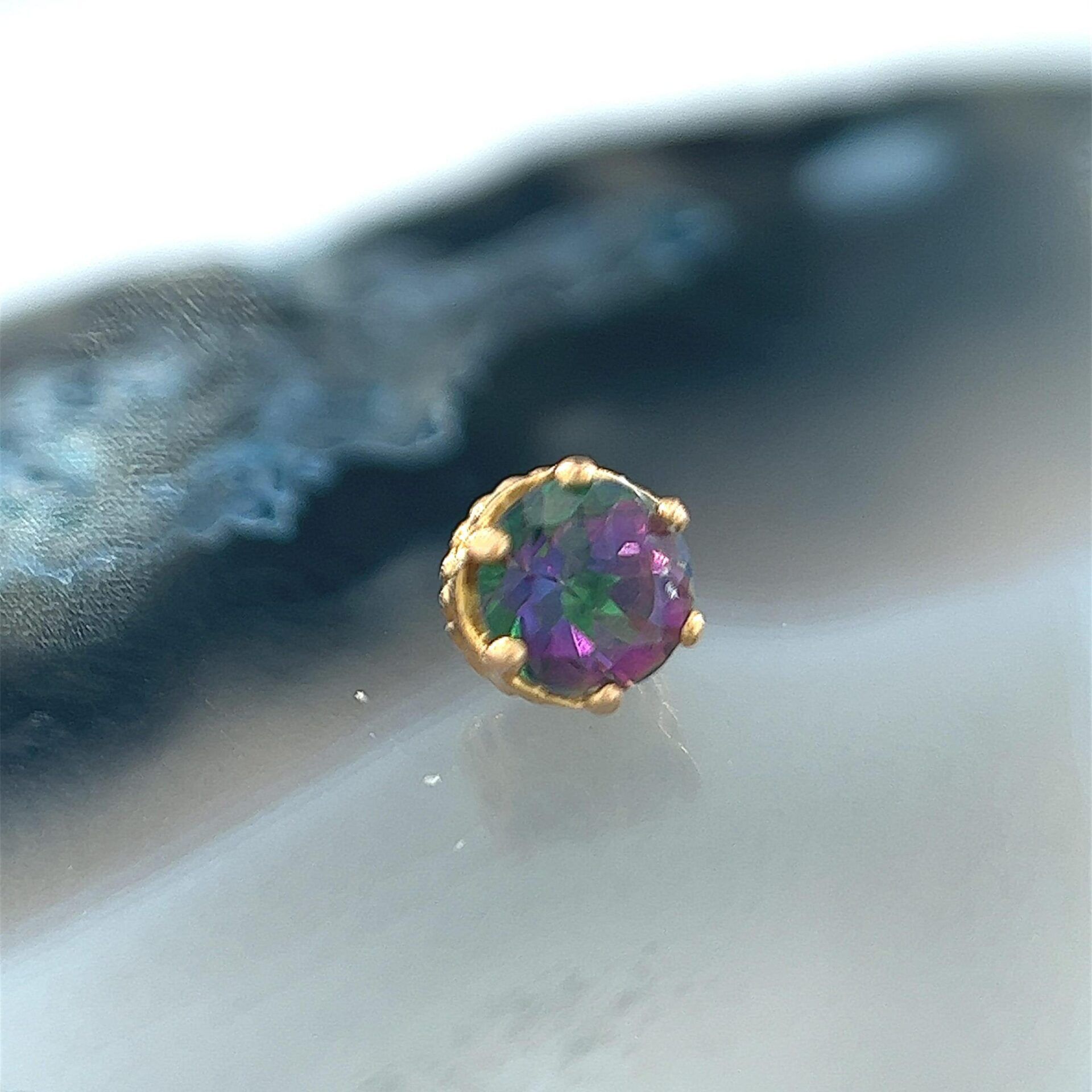 Crafted from solid 18k rose gold, this threaded end features a resplendent 3mm Queen Crown-Set Brilliant-Cut Round Faceted Mystic Topaz gemstone. The mystic play of colors within the topaz adds a captivating and enchanting accent to your body adornment.
