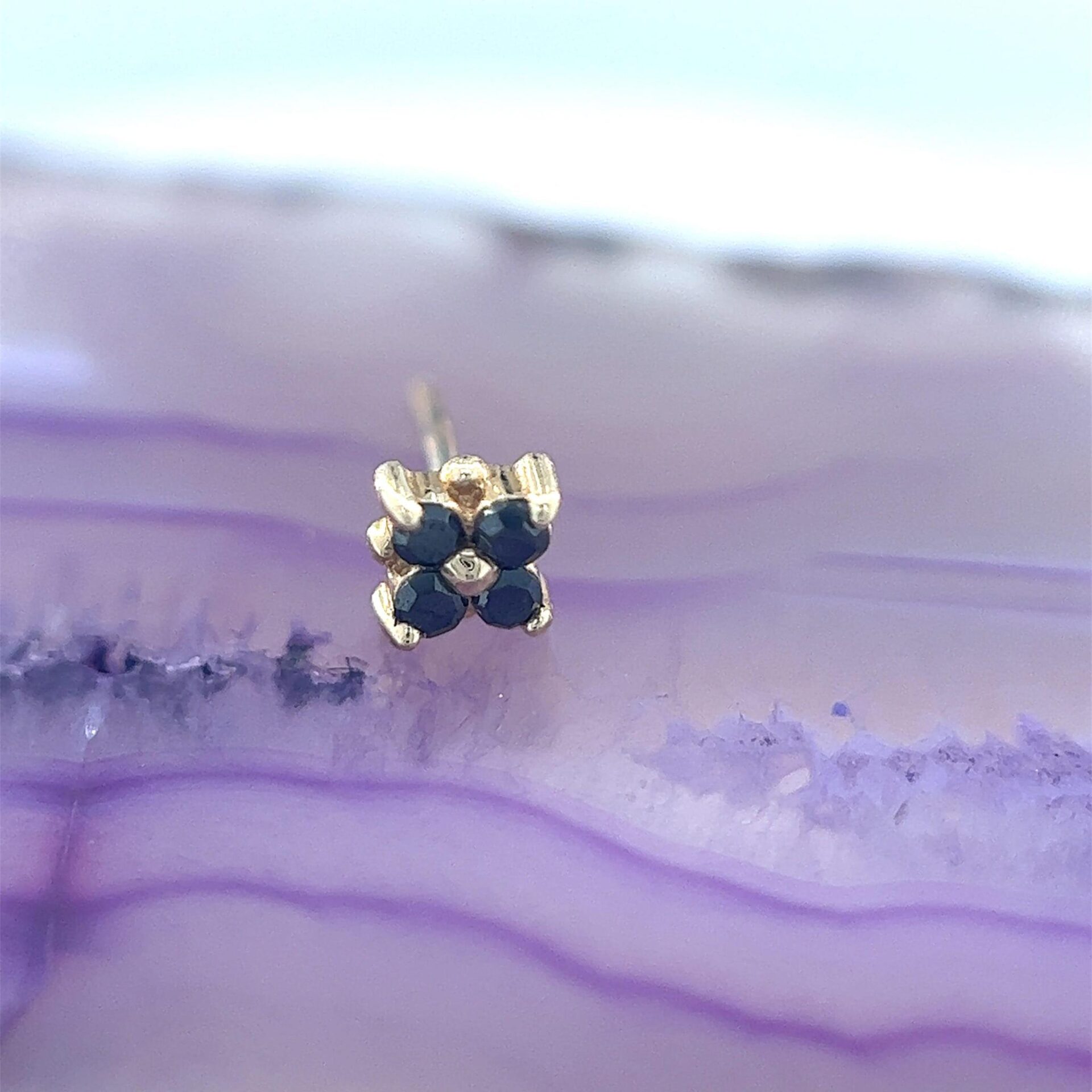 Make a subtly dramatic statement with the Reema black diamond body jewelry by BVLA. Four glimmering 1mm black diamonds prong set in an asymmetrical formation, their rich darkness accented by delicate beaded detailing. Expertly crafted from striking 14k yellow gold with BVLA’s signature satin finish. Measuring just 2.7mm wide, this dainty press fit piece packs bold edge, elevating tragus and helix piercings. Black diamonds inspire confidence, mystery and resilience. BVLA’s innovative press fit setting enables effortless styling. For edgy minimalists who fancy body jewels, Reema ignites your look with artistic flair and just a touch of gothic allure.
